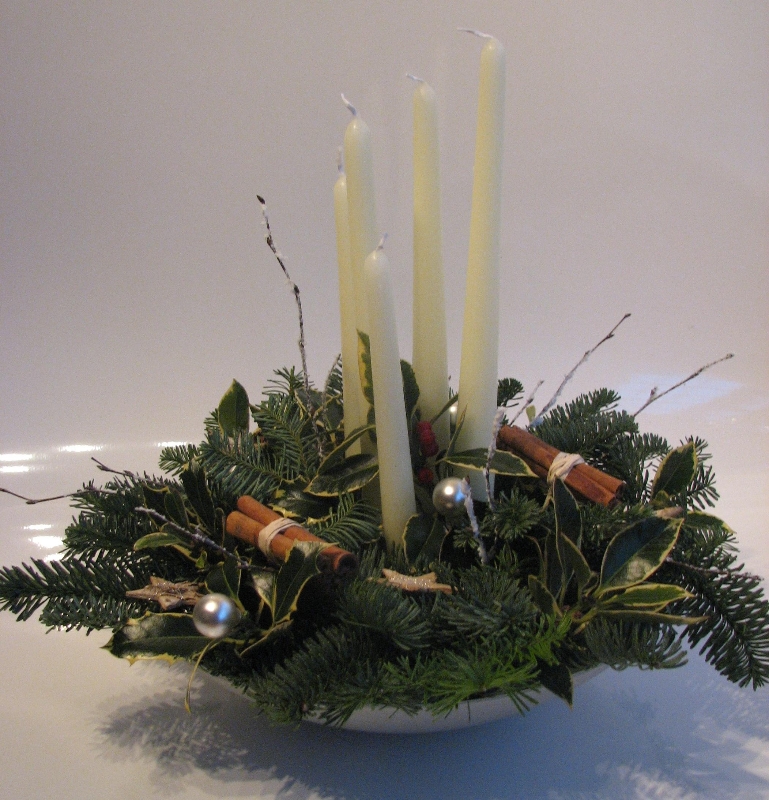 Modern Christmas table arrangement with candles. Large, low thick ceramic  bowl (choose from grey or pink from the drop down menu)with five candles of differing heights, set amongst long Christmas foliages and Christmas glass baubles, cinnamon, orange slices. Flowers can be added in the drop down menu.