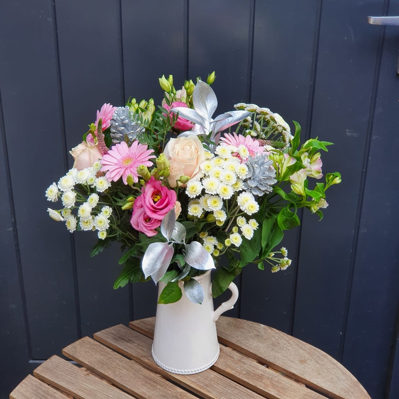 A beautiful mix of pinks and white with silver foliage or twigs and cones. A perfect, easy to look after Christmas present.