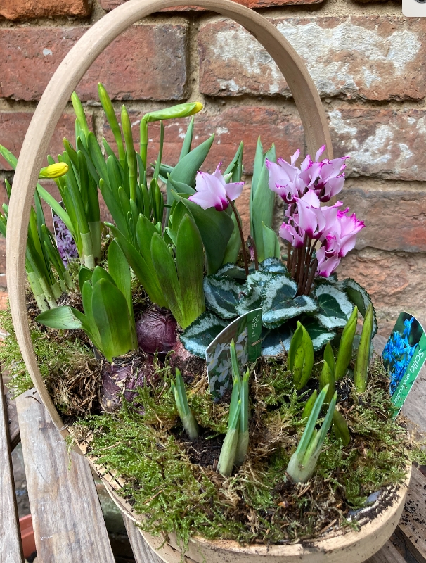 A large traditional trug full of spring bulbs such as; tete a tete, hyacinth, muscari, scilla, iris and cyclamen or primula.