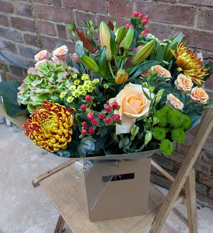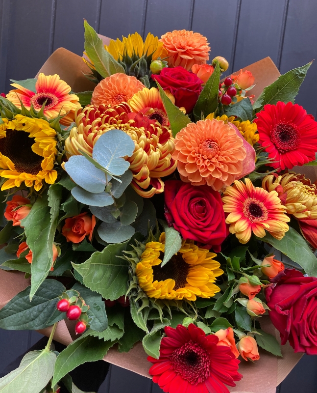 A beautiful autumn display of seasonal blooms such as ; roses, sunflowers, Germini, berrys, oak, alstroemeria, spray roses and more in autumnal shades