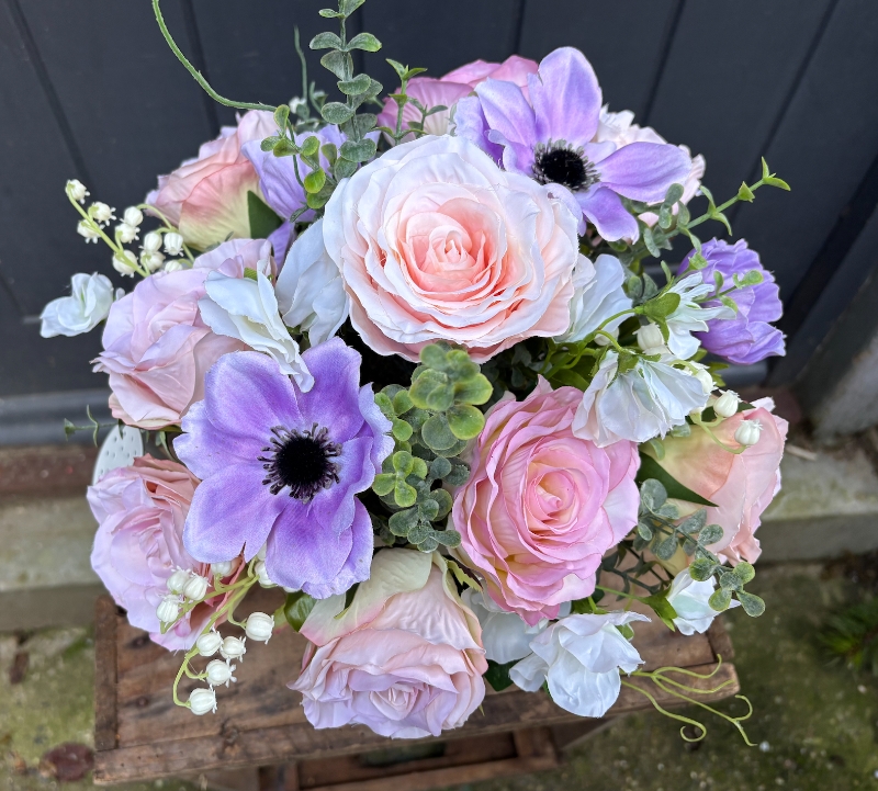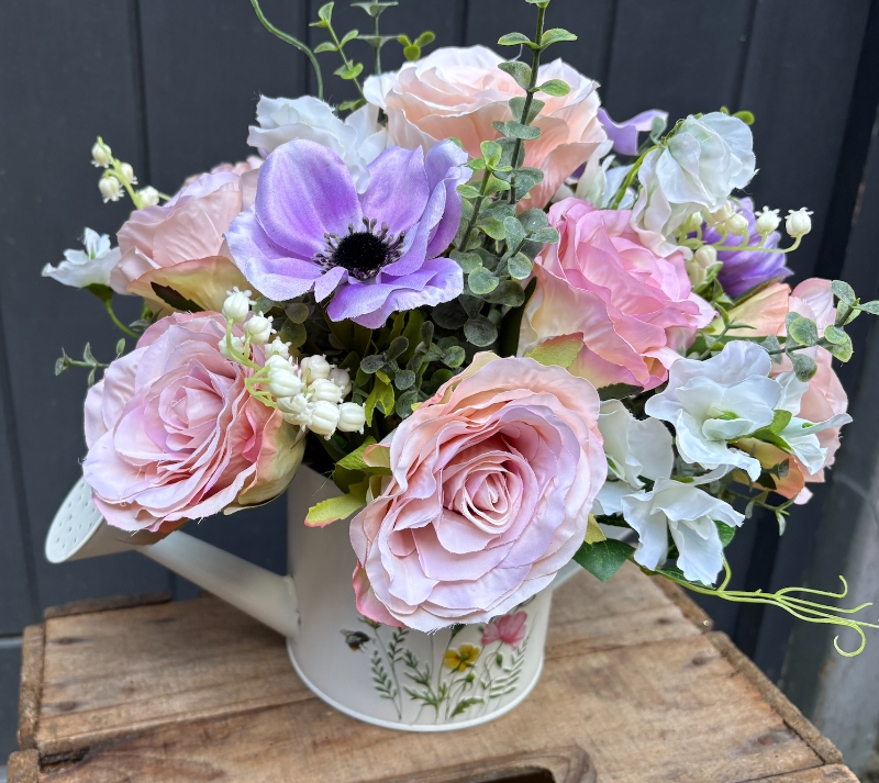 SILK flowers in pastel shades in a pretty zinc watering can with pattern